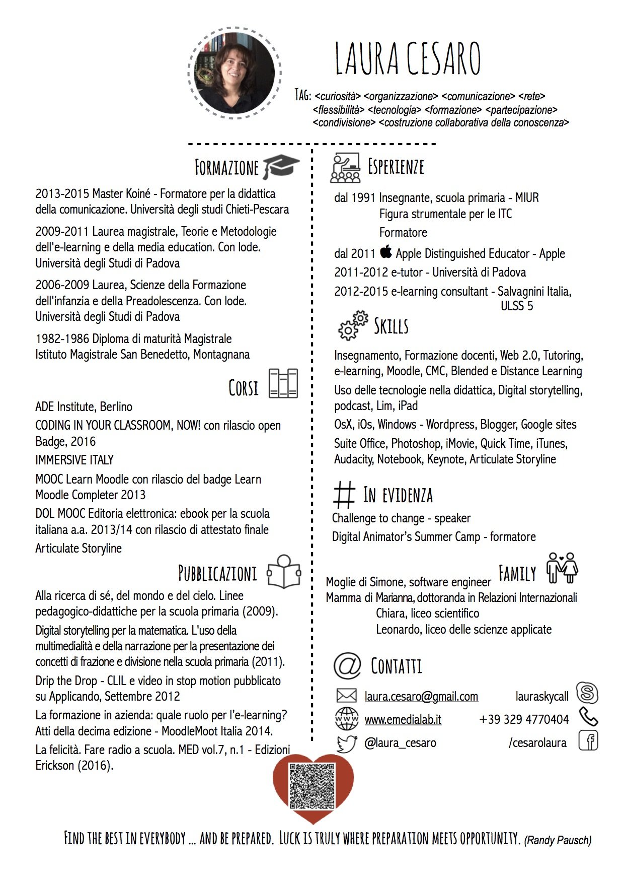 A livello di Istituto ho ricoperto l’incarico prima di supporto e poi di figura strumentale come sostegno al lavoro docente, assistenza e formazione informatica dal 2009. Ho realizzato il sito web del mio Istituto comprensivo, seguendo anche la parte relativa all’amministrazione trasparente e all’albo online, dopo la partecipazione a corsi di formazione. Ho seguito l’introduzione del registro elettronico formando i docenti. Amministro la piattaforma Moodle di Istituto e da quest’anno anche GAFE. Sono progettista per il PON Lan-Wlan. Ho contribuito all’ideazione e alla nascita dei blog delle scuole dell’Istituto, per la condivisione di documentazione e di lavori digitali realizzati dagli alunni. Nel 2011 Apple mi ha riconosciuta docente innovativo, inserendomi nella comunità degli Apple Distinguished Educators. Nell’anno scolastico 2015/16 ho sperimentato la metodologia flipped classroom con BYOD, dopo esperienze di digital storytelling per la matematica, di video in stop-motion, di laboratorio radiofonico. Ho formato docenti all’uso di iPad per il montaggio di video e la documentazione, in particolare per un progetto CLIL di rete.